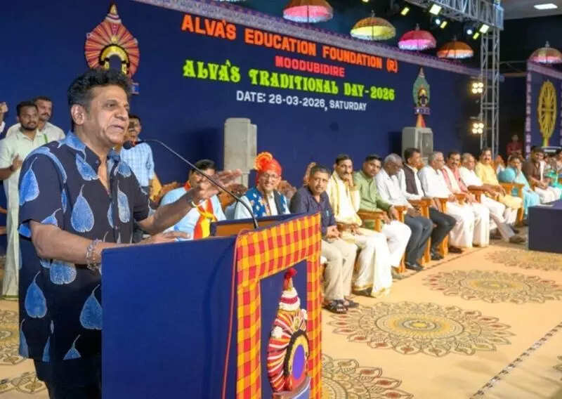 Mangaluru: A vibrant confluence of India’s diverse cultural traditions marked ‘Alva’s Traditional Day-2026′ celebrations held at Vidyagiri campus of Alva’s Education Foundation on Saturday.The event witnessed the presence of Kannada actor Shivarajkumar and his wife Geetha, who lauded the institution for showcasing a miniature version of India’s cultural richness.Inaugurating the programme, the actor appreciated the spirit of inclusiveness displayed by the students. “To achieve anything in life, one must have a generous heart. I see that quality here. Karnataka’s culture lies in embracing everyone,” he said, urging students to remain united and grow together.Recalling his earlier visit to Moodubidire during the shooting of the film ‘Smile’, he expressed gratitude for the continued affection he has received over four decades. “I feel blessed to receive the same love even today,” he said.The actor added a lively touch to the celebrations by singing and dancing to popular Kannada songs, including numbers from his debut film ‘Anand’ and songs associated with his late brother Puneeth Rajkumar, drawing enthusiastic response from the students.Earlier, he was escorted to the venue through a colorful cultural procession representing various regions of India. Addressing the gathering, Geetha described the experience as “a blessing to witness multiple cultures on a single platform” and praised the students for their enthusiasm.Alva’s Education Foundation chairman M Mohan Alva presided.The programme also featured the presentation of a portrait created by disabled student Kaushik to the chief guests. Film personalities including Rahul Amin, Shailashree Mulki, Disha Shetty, and Sahil Rai were present, along with former minister Abhayachandra Jain and management trustee Vivek Alva.Cultural showcaseStudents representing Maharashtra, Gujarat, Northeastern India, Kerala, Karnataka, coastal Karnataka and other parts of India presented traditional art forms. The campus was adorned with cultural exhibits, while students dressed in traditional attire added to the visual appeal.Regional cuisinesThe event also featured a food festival offering regional delicacies from across India. Dishes such as Kerala-style kappa and fish curry, Malabar biryani, idiyappam, coastal Karnataka’s kori rotti and fish preparations, Manipur’s singju, momos, and popular items like chole bhature, pani puri, and Hyderabadi biryani were served.