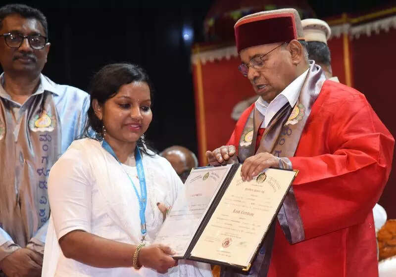 Mangaluru: Mangalore University topper Sandhya N Maninalkur’s inspiring journey from milking cows at dawn and rolling beedis late into the night to winning a gold medal and seven cash prizes in MA Kannada is a testament to her determination against poverty and hardship. She was honoured at the 44th convocation of Mangalore University chaired by Karnataka governor Thaawar Chand Gehlot on Saturday.From a young age, Sandhya had to balance her academics with work due to her family’s financial struggles. Her parents, a daily wage worker father suffering from severe hand pain, and a mother who rolls beedis for a living, relied on every income source to make ends meet. She started rolling beedis in class 7 to help support her family, and continue her schooling. Her daily routine was demanding, often involving milking cows in the early morning and contributing to the family’s income by rolling beedis in the evening. After securing a science degree with physics, chemistry, and mathematics, Sandhya ultimately followed her passion for literature, by pursuing it for her postgraduate degree in Kannada.“My interest in literature and passion for writing poems and articles motivated my decision to pursue Kannada. The able guidance of teachers helped me to overcome the challenge of shifting my focus in education from science to literature,” Sandhya said, expressing her gratitude to her teachers, parents and younger sister for their constant support.On her future ambition, Sandhya said that pursuing a PhD in Kannada has been her dream. “After graduation, I taught at a college for a year. Now I have stopped rolling beedis to pursue BEd. I will pursue a PhD in Kannada after the completion of BEd. My parents have also expressed their support to make my dreams a reality. My mother has been working to cover the family’s basic expenses,” she added.Meanwhile, another student, Fathima Shaloola from Uppala, Kasaragod, bagged two gold medals and three cash prizes in Master of Communication and Journalism. Kavya from Kanhangad, Kasaragod, secured the first rank in MA Sociology, and won two gold medals.