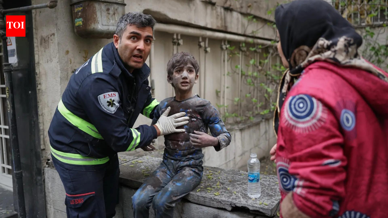 A first responder assists an injured boy following a strike that hit a residential building amid the US-Israeli military campaign in Tehran, Iran, Saturday (AP)