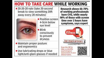Bengaluru: Have you been feeling a nagging sensation in your eyes, often accompanied by redness and watering? Then you might be experiencing Computer Vision Syndrome (CVS), say ophthalmologists, as a significant section of the IT city’s working population shows one or more symptoms of the condition.CVS is a group of eye and vision-related problems caused by prolonged use of screens. “Existing research shows around 66–70% of working professionals have CVS, while nearly 90% of those with screen time exceeding three hours experience symptoms. In our own practice, we have seen at least 47% of patients present with signs of CVS,” said Dr Naren Shetty, director, HOD cataract & refractive, clinical & translational scientist, Narayana Nethralaya.While CVS is increasingly being reported across age groups — from children as young as nine to elderly individuals in their 90s — experts say working professionals remain the most vulnerable. “On average, I see about 4–5 patients per day with symptoms related to computer vision syndrome. And this is in the central part of Bengaluru. So, if we are seeing these many cases here, the numbers in tech-heavy areas like like Electronics City or Whitefield would likely be even higher,” said Dr Mahima Mahesh, consultant ophthalmologist, Dr Agarwals Eye Hospital, Coles Road.She added, “The human eye is naturally at rest when looking at distant objects. But for near tasks, the eye muscles have to actively work to focus. So, if someone is working on screens all day, the same group of eye muscles is continuously engaged, leading to fatigue by the end of the day.”Dr Savitha Arun, senior eye surgeon and medical superintendent, Nethradhama Super Speciality Eye Hospital, said CVS is not limited to eye-related issues. “Many patients also report neck pain, sleeplessness, and back pain, often due to poor posture while sitting in front of screens for long hours without breaks. Ergonomics plays a significant role in these symptoms,” she said.Management of CVS is holistic and involves addressing multiple factors, starting with symptomatic treatment for eye discomfort and evaluating whether corrective glasses are needed. “We also guide patients on proper ergonomics, including posture and workstation setup, along with emphasising regular breaks and healthy screen habits, while treating dryness if present. In cases where there is muscle imbalance, specific eye exercises are prescribed, with more severe cases requiring in-clinic therapy,” Dr Savitha said.Doctors also stress adopting the 20-20-20 rule — every 20 minutes, look at something 20 feet away for 20 seconds. Dr Naren added even small ergonomic changes can help. “Instead of positioning the screen at eye level, placing it about 4–5cm below eye level can reduce strain, as the eyelids offer better protection when the eyes are directed slightly downward,” he said.Inset 3: Prevention20-20-20 rule (take a 20-second break to view something 20ft away every 20 minutes)Position the screen 4–5cm below eye levelBlink consciously to prevent drynessMaintain proper posture and ergonomicsUse lubricating drops or blue light/anti-glare glasses if needed