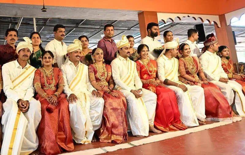 Mangaluru: Blending tradition with simplicity, the Perne Muchilot Bhagavathi Temple near Kumble hosted a mass wedding ceremony on Wednesday, where 11 couples tied the knot in the presence of thousands of devotees and well-wishers. The temple is located about 50km from Mangaluru in Kasaragod district of Kerala.Accompanied by festive music and rituals, the brides and grooms walked into the wedding hall to exchange garlands, marking the beginning of the ceremony. Known for hosting mass weddings of the Ganiga/Vaniya community, the temple upholds a tradition that celebrates equality and minimalism. Couples from Puttur, Sullia, Bantwal in Dakshina Kannada and Kasaragod participated in the biannual event. The ceremony began with the grooms receiving blessings from the temple’s Darshana Patris, followed by traditional rituals, including the presentation of saris to the brides and the tying of the mangalsutra. The newlyweds then sought blessings from Goddess Bhagavathi, priests, parents and well-wishers.Temple committee member Gopalakrishna said the mass wedding is held twice a year, during the Pooram Utsav in March-April and the Udayastamana Utsav, usually in Nov. “After a thorough verification process, eligible couples are selected to be part of this ceremony,” he added.